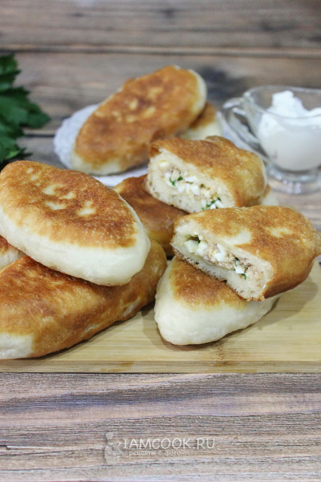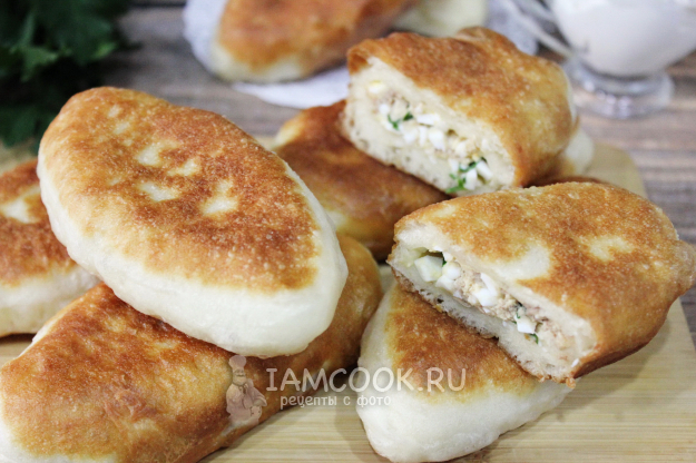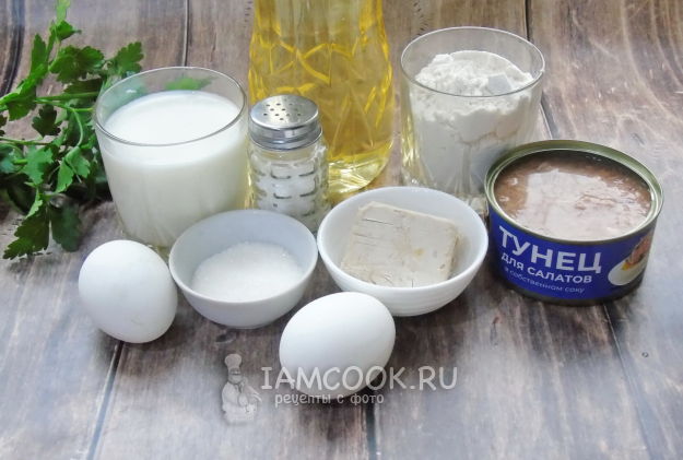 Все ингредиенты для приготовления жареных пирожков с тунцом на сковороде - перед вами, на фото.