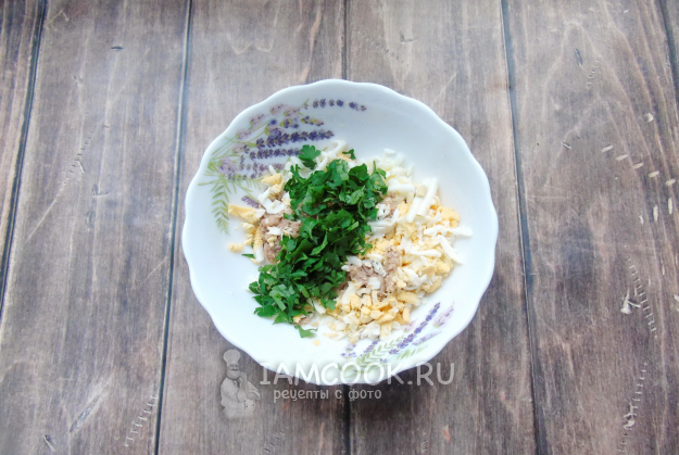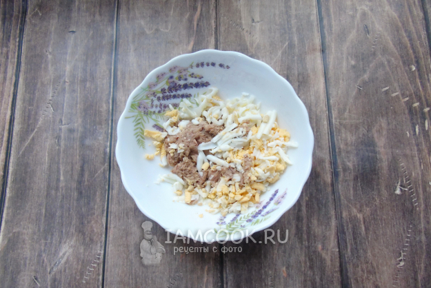 А пока тесто доходит до нужной кондиции, займитесь начинкой. Яйца сварите вкрутую. Для этого выложите их в кастрюлю и залейте водой. Варите 10 минут с момента закипания. Затем достаньте из кастрюли, охладите, очистите и натрите на терке или разомните вилкой. Из банки с тунцом слейте жидкость и разомните рыбу. Добавьте яйца.