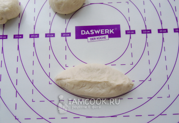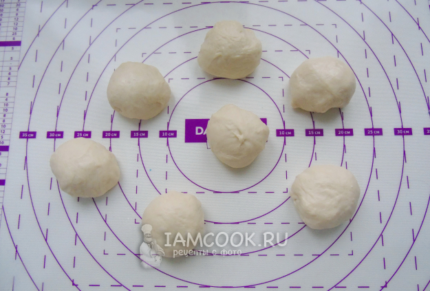 Подошедшее тесто достаньте из миски и обомните. Затем разделите на шарики весом приблизительно 50-60 граммов.