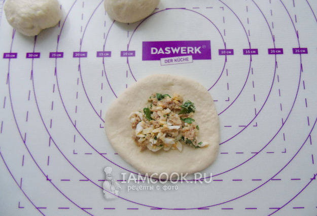 Каждый шарик раскатайте в лепешку. На середину выложите столовую ложку начинки.