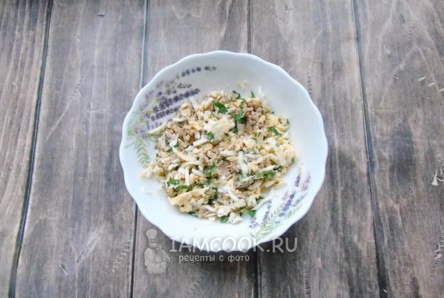 Начинку посолите, поперчите по вкусу и перемешайте.
