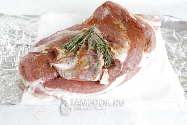 Подготовленную лопатку выложить на лист пергамента с фольгой. Сверху выложить веточки розмарина и тимьяна. Мясо убираем в холодильник под пленку на сутки, а можно и на 2 суток. Процесс маринования не рекомендую пропускать, так как именно при мариновании мясо баранины получается невероятно нежным и сохраняет свою сочность.