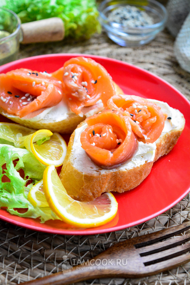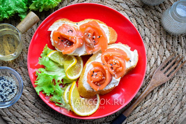 Готовые кростини с лососем украшайте зернами кунжута и листьями салата, подавайте к столу.