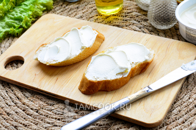 Обжаренные ломтики багета смажьте сливочным крем-сыром.