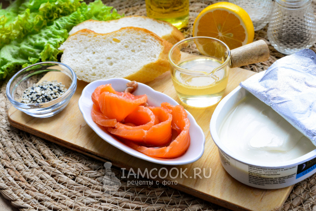 Соберите все продукты для приготовления кростини с лососем.