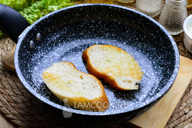 Ломтики багета полейте оливковым маслом и обжаривайте на сковороде несколько секунд, до хрустящей корочки. Затем багет снимите со сковороды, пусть он остынет.