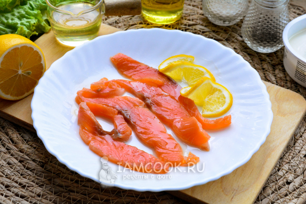 Слайсы слабосоленого лосося полейте оливковым маслом, сбрызните лимонным соком и полейте медом. Оставьте рыбу мариноваться на 10-15 минут, так она станет еще вкуснее.