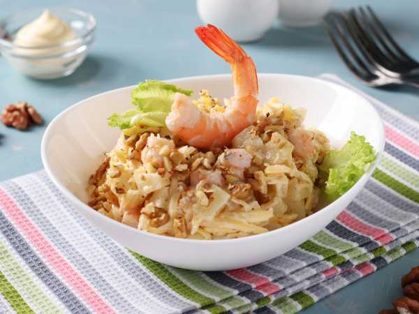 Разогрейте сковороду с оливковым маслом. Положите в нее 2 зубчика чеснока. Слегка припустите чеснок на оливковом масле. Как только уловите свежие нотки чеснока, удалите его. Выложите креветки и жарьте их в течение 5 минут. Готовые креветки слегка посолите и поперчите.