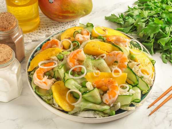 Соберите все продукты по списку и начнём приготовление вкусного тайского салата с манго и креветками. Креветки для этого салата можно отварить, а можно обжарить на оливковом масле. Салат с жареными креветками мне нравится больше - на мой взгляд, он получается вкуснее.