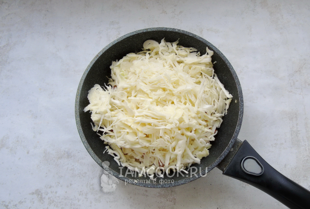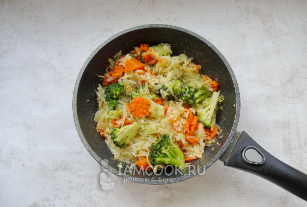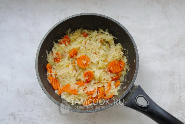 Накройте сковороду крышкой и тушите капусту с морковью и луком до испарения жидкости.