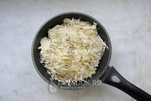 Снова накройте сковороду крышкой. Тушите капусту еще 3-4 минуты и выключайте плиту.