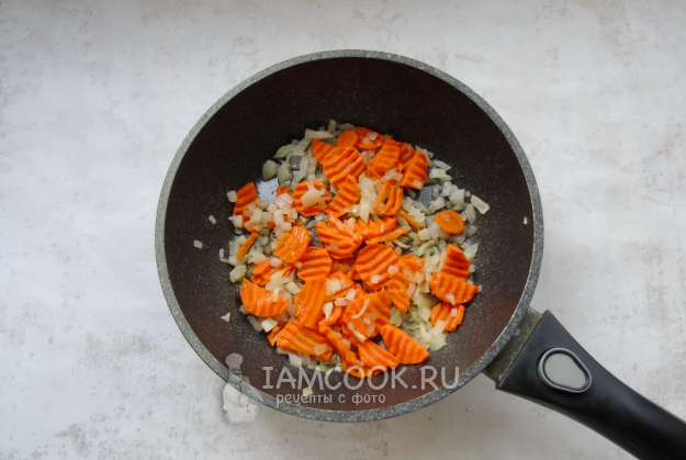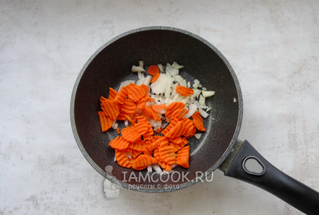 Морковь и репчатый лук очистите, помойте и нарежьте произвольно. Выложите в сковороду с растительным маслом.