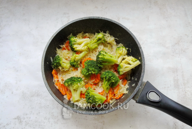 Брокколи помойте, разберите на соцветия и добавьте в сковороду.