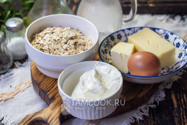 Соберите необходимые продукты для приготовления овсяной каши с сыром и яйцом. Овсяные хлопья желательно взять те, которые долгой варки. Варить их я предпочитаю на воде (можно и на молоке). Я взяла два вида сыра: плавленый и твердый - так получается вкуснее. Плавленый сыр можно заменить на творожный, тоже будет вкусно.