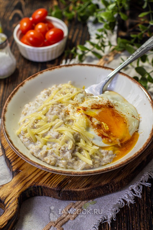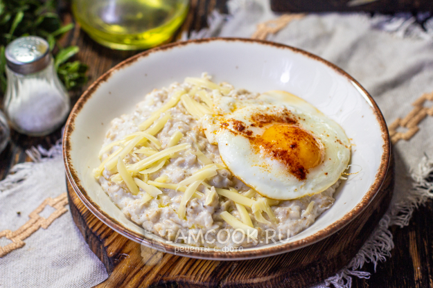 Дополните тарелку одним жареным яйцом и сразу подавайте - овсянка с яйцом и сыром.