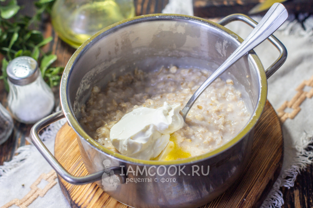 В овсяную кашу добавьте по вкусу соль, совсем небольшой кусочек сливочного масла (не обязательно) и плавленый сыр. Тщательно перемешайте, чтобы сыр разошелся в каше.