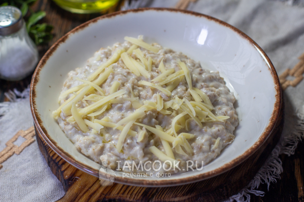В тарелку насыпьте горячую кашу и добавьте совсем немного тертого твердого сыра.