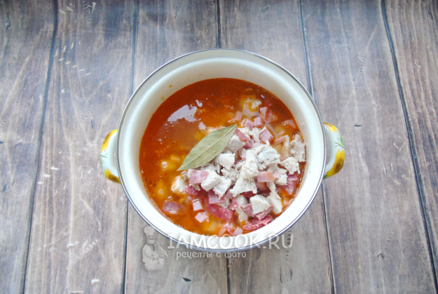 Выложите нарезку в кастрюлю. Добавьте лавровый лист, соль, перец черный молотый. Если квашеная капуста очень кислая, то добавьте сахар по вкусу. Варите солянку еще 15 минут и выключайте плиту.