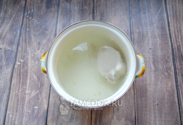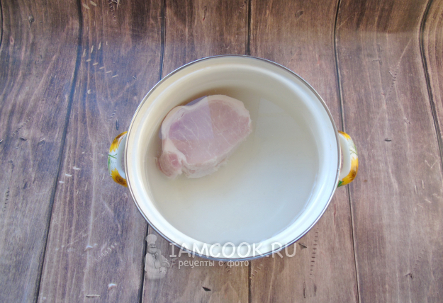 Сварите бульон. Для этого помойте свинину и выложите в кастрюлю. Залейте водой.