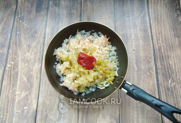 После добавьте квашеную капусту и мелко нарезанный соленый огурец.