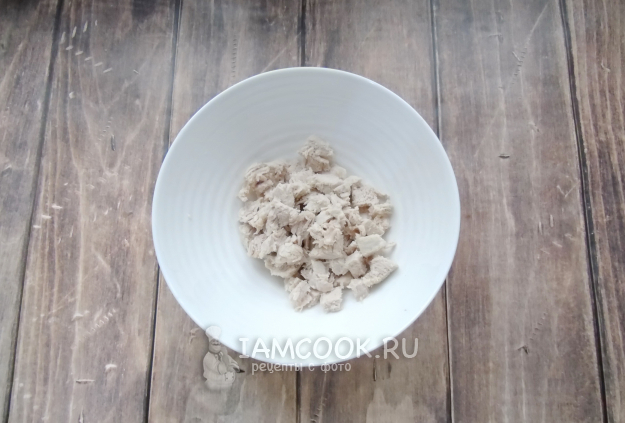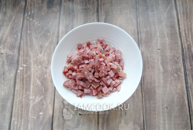 Кубиками нарежьте сырокопченую и полукопченую колбасу.