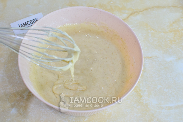 Готовое тесто на оладьи должно быть достаточно густым. Вмешайте в него соду и больше не перемешивайте. Сода вступит в реакцию с кефиром.