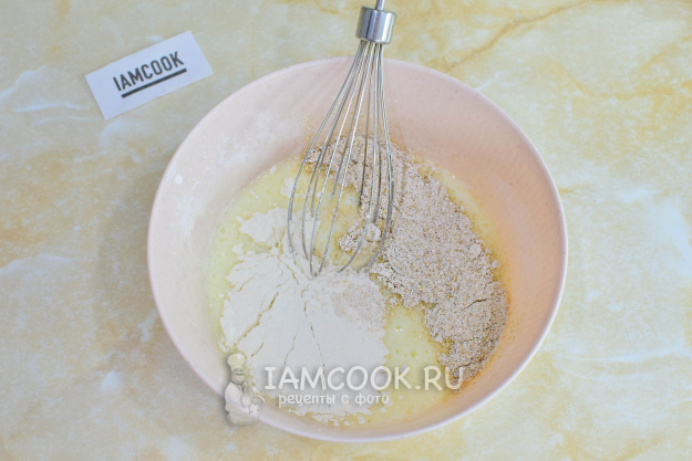 Добавляйте в тесто отруби и муку. Замешивайте тесто.