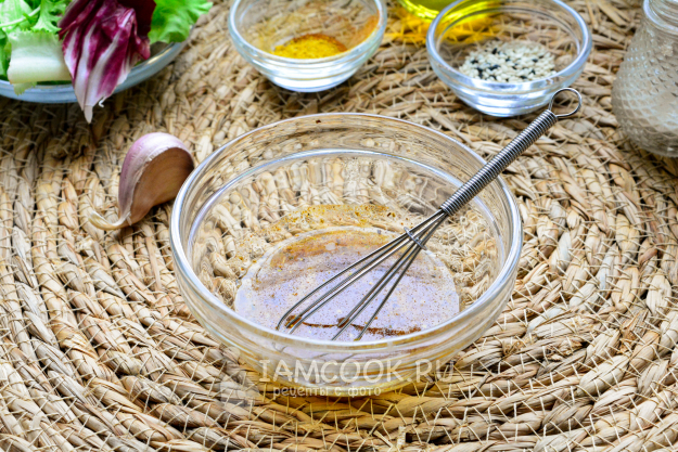Оливковое масло смешайте с измельченным чесноком и всыпьте необходимые специи. Для такого салата идеально подходят молотый острый красный перец, куркума и кориандр. По желанию можете влить немного соевого соуса. Перемешайте все компоненты для соуса, добавьте соль и черный молотый перец по вкусу.
