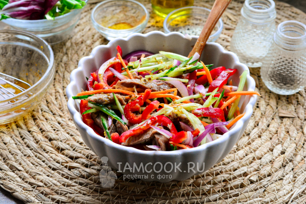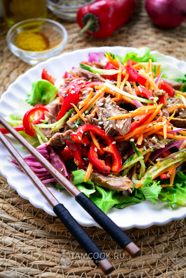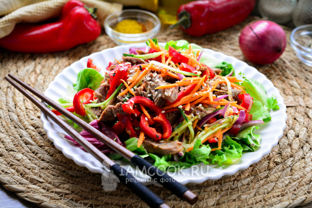 Готовый салат с говядиной в азиатском стиле подавайте к столу, выложив его на зеленую подушку из листьев салата, украсив зернами кунжута.