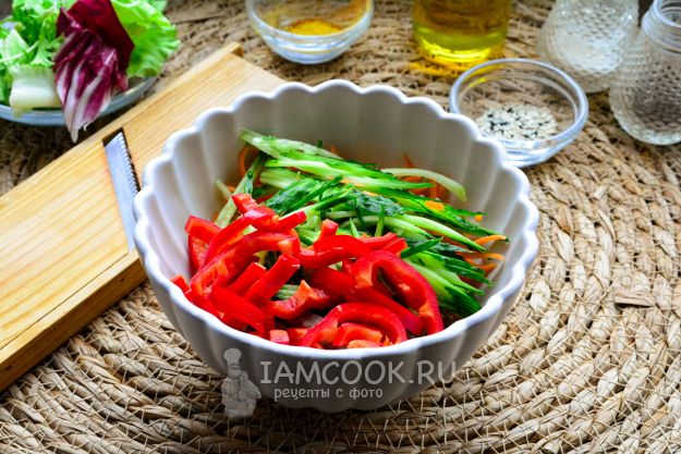 Тонкой соломкой нарежьте свежие огурцы, добавьте и нарезанный полосками сладкий красный перец.