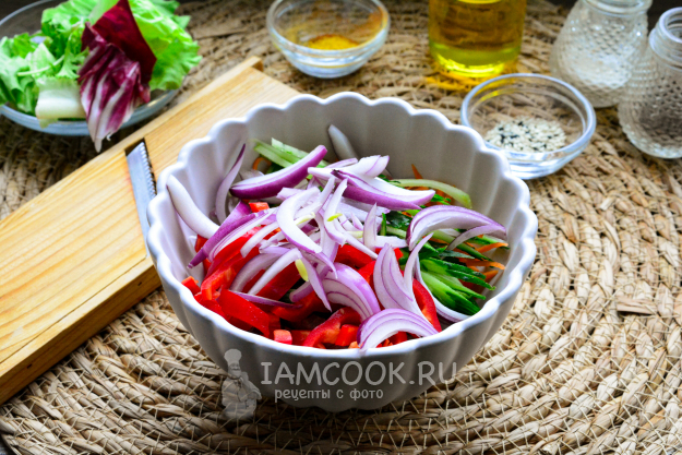Нарежьте полукольцами красный лук и выложите его в салат.