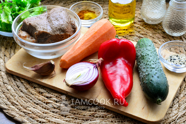Соберите необходимые продукты для приготовления салата с говядиной в азиатском стиле.