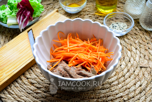 Отварную говядину нарежьте соломкой для салата. Также натрите морковь на корейской терке.