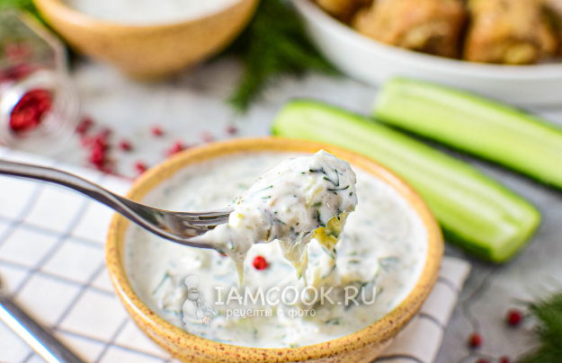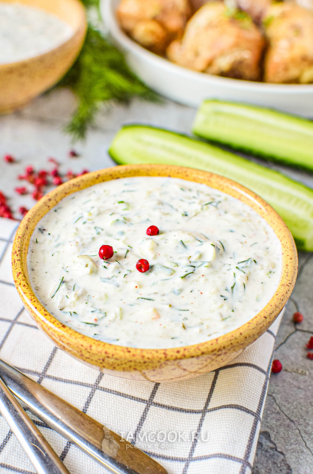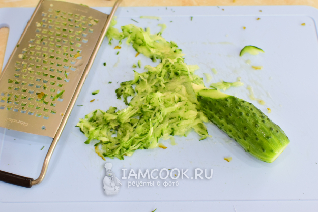 Свежий огурец потрите на средней терке. Если из него появится жидкость, то удалите её. Также огурец можно просто мелко нарезать. Вмешайте огурец в соус.