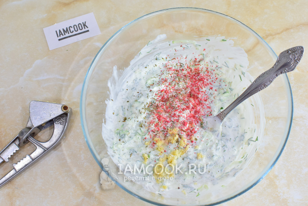Пропустите через пресс чеснок. По вкусу подсыпьте соль и специи. Я добавляю паприку и сушеный базилик.