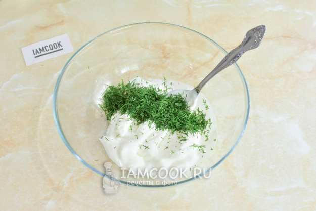 Выложите в миску сметану и йогурт. Добавьте горчицу. Я беру горчицы совсем немного, так как не люблю её явно выраженный вкус. Только чтобы появилось легкое послевкусие