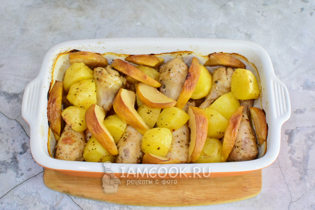 Курица с айвой и картофелем готова! Разложите по тарелкам и подавайте к столу.