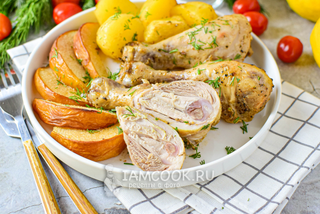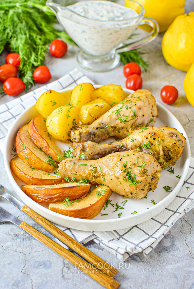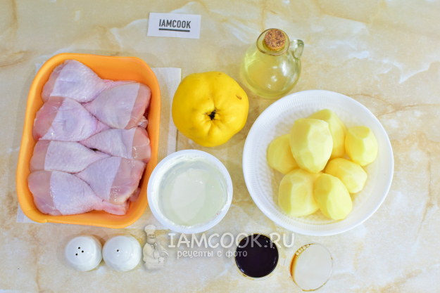 Чтобы приготовить курицу с айвой и картошкой в духовке, соберите необходимые ингредиенты по списку. Курицу можно взять целиком или же любые её части. Я буду готовить куриные голени.