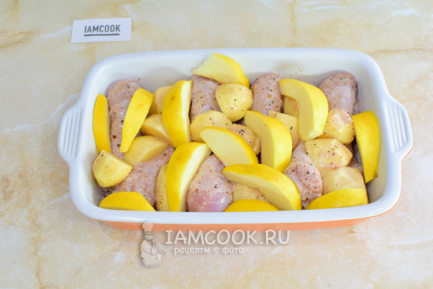 Выложите в форму к курице картофель и нарезанную айву. Полейте оставшимся маринадом.