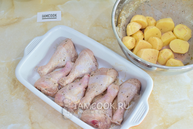 Для запекания подойдет любая жаропрочная форма. Смажьте дно и бока формы растительным маслом. Выложите курицу. В оставшийся маринад окуните нарезанный картофель.