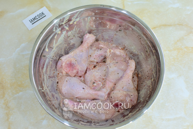 Куриные голени полностью обмажьте получившимся маринадом и оставьте постоять на 1-2 часа.