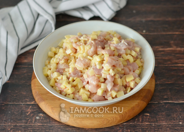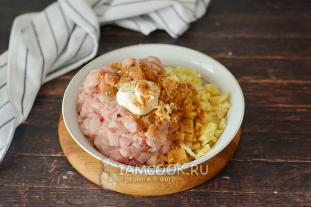 Нарежьте мелким кубиком куриное филе. Также мелким кубиком нарежьте сырой картофель. Сложите их в миску, добавьте спрессованный чеснок, майонез, соль-перец и приправу для курицы.