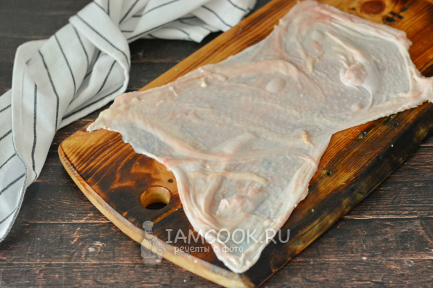 На разделочной доске разложите куриную кожу, расправив её.