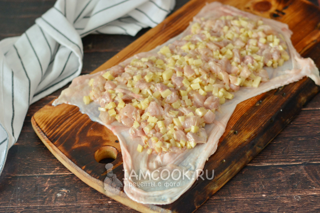 На кожу ровным слоем выложите начинку из куриного филе и картошки и уплотните её руками.