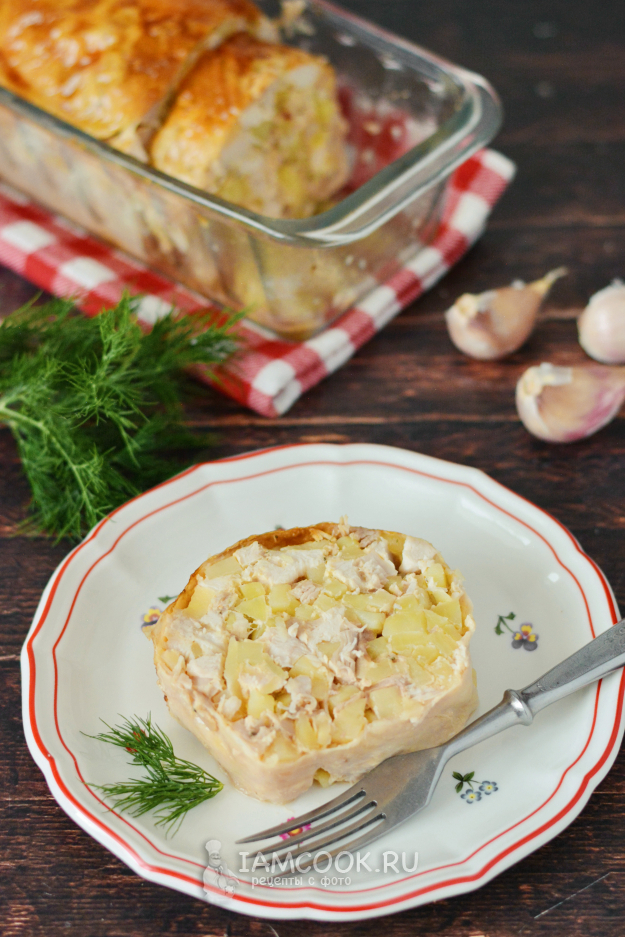 Куриный рулет с картошкой готов. Выньте его из духовки, дайте отдохнуть 10-15 минут, и можно подавать.