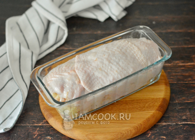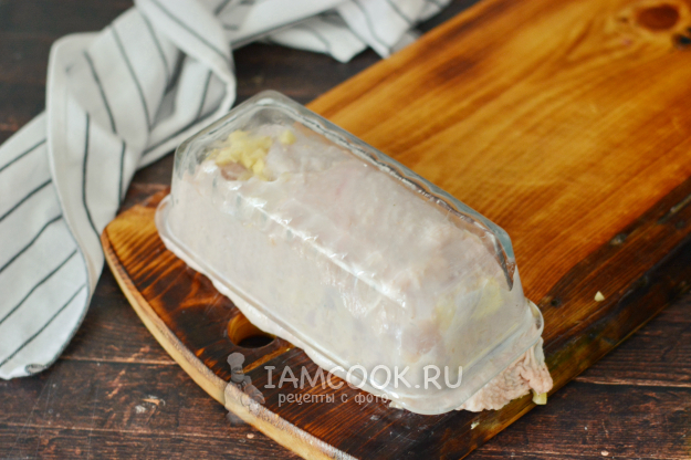 При необходимости слегка расправьте кожу сверху и подоткните её по бокам рулета. Установите форму на противень и поместите в холодную духовку.