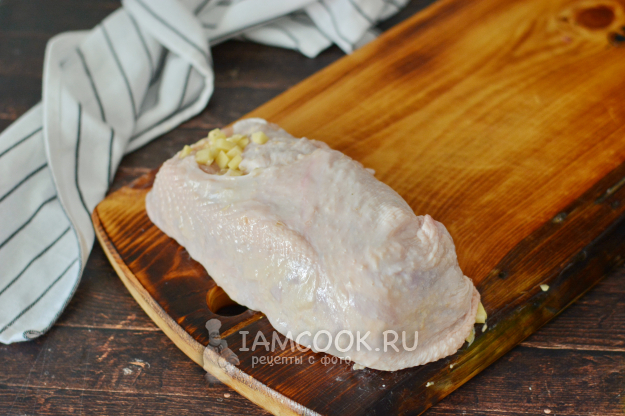 Скажу честно, сделать это не очень просто, так как кожа куриная очень подвижна, да и начинка норовит высыпаться. Но всё же свернуть этот рулет можно, важно не спешить.