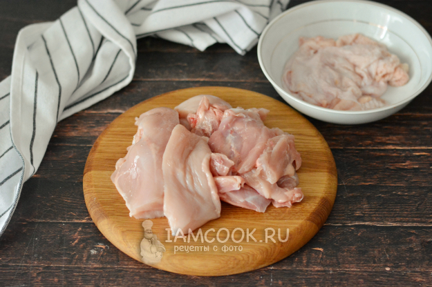 А затем срежьте с курицы часть филе. Для этого рулета потребуется примерно 600-700 г филе. Я взяла филе с двух окорочков и филе одной грудки.