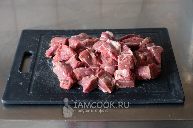 Мясо порежем кусочками с размером стороны приблизительно 3-4 сантиметра.