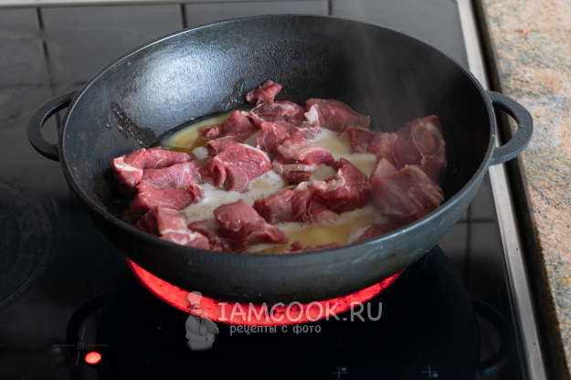 Когда масло растает, увеличим огонь до максимума и засыплем в масло кусочки мяса (если лук на тот момент ещё не порезан - не беда). Время интенсивной термической обработки на сильном огне - 10 минут. Без крышки.